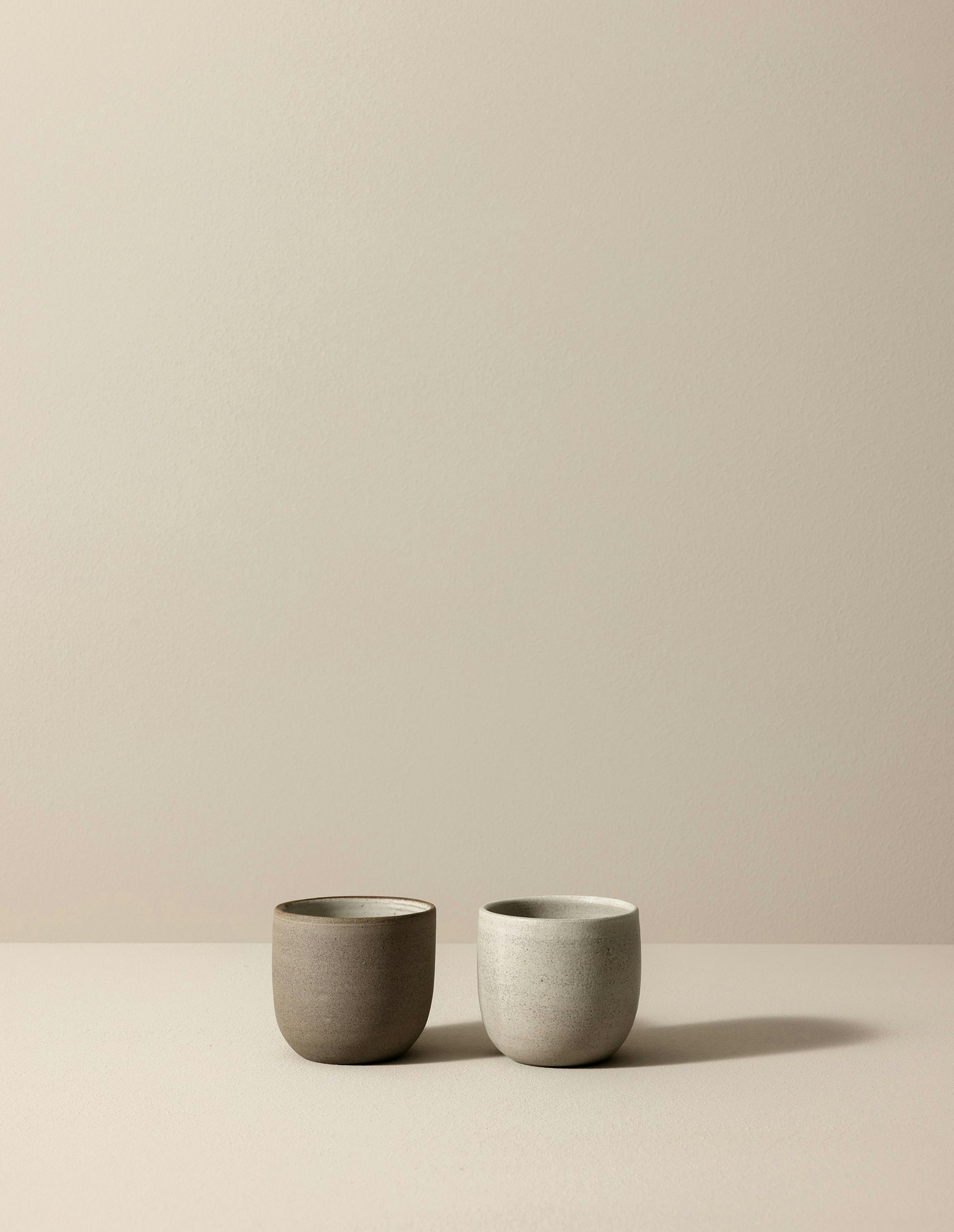 Our beloved Studio Latte Cup comes in two versions: A brown version with raw grey-brown clay outside and a matte white glaze inside that gives a fine textured feel and look. And a white version that is fully glazed for a smoother surface.