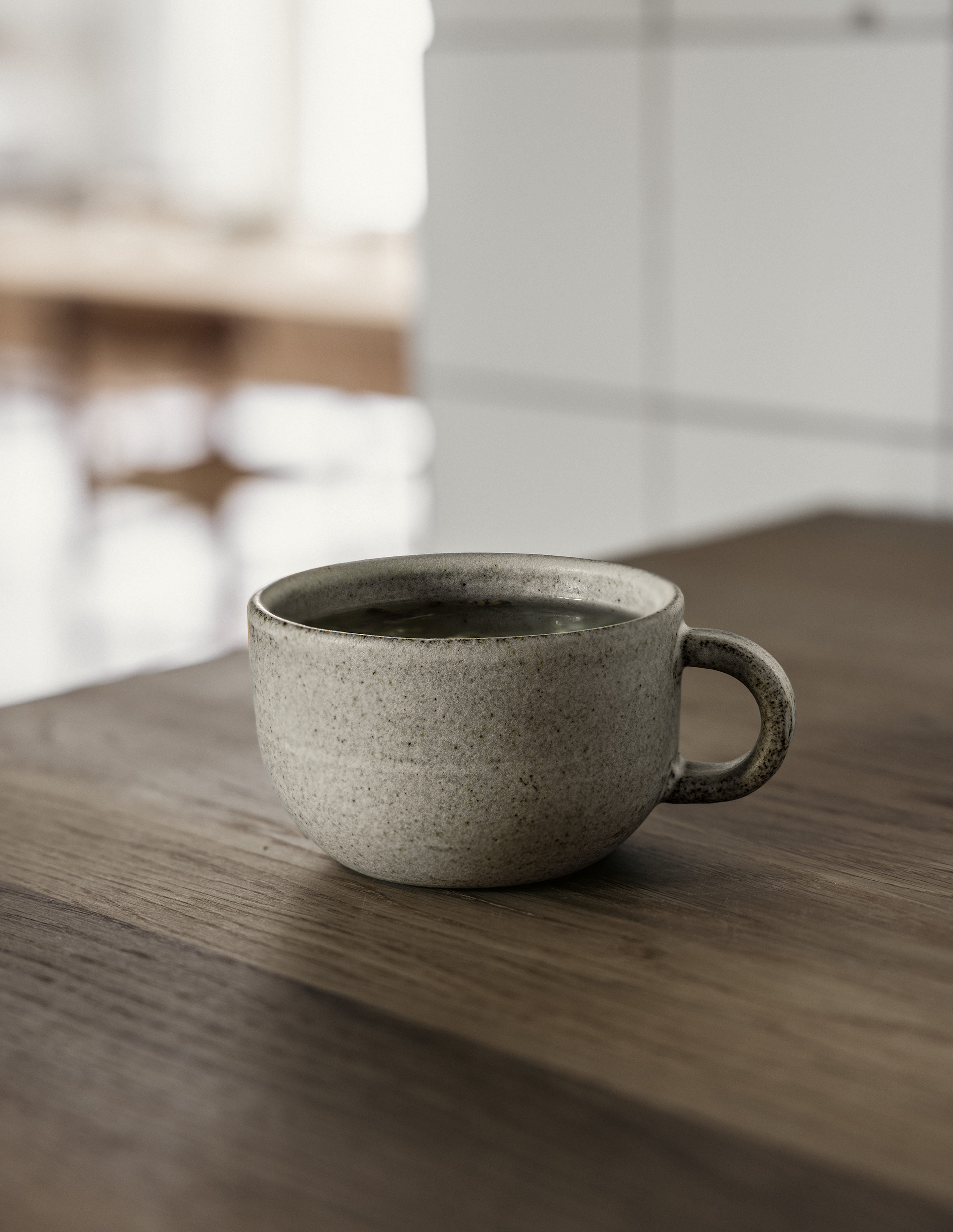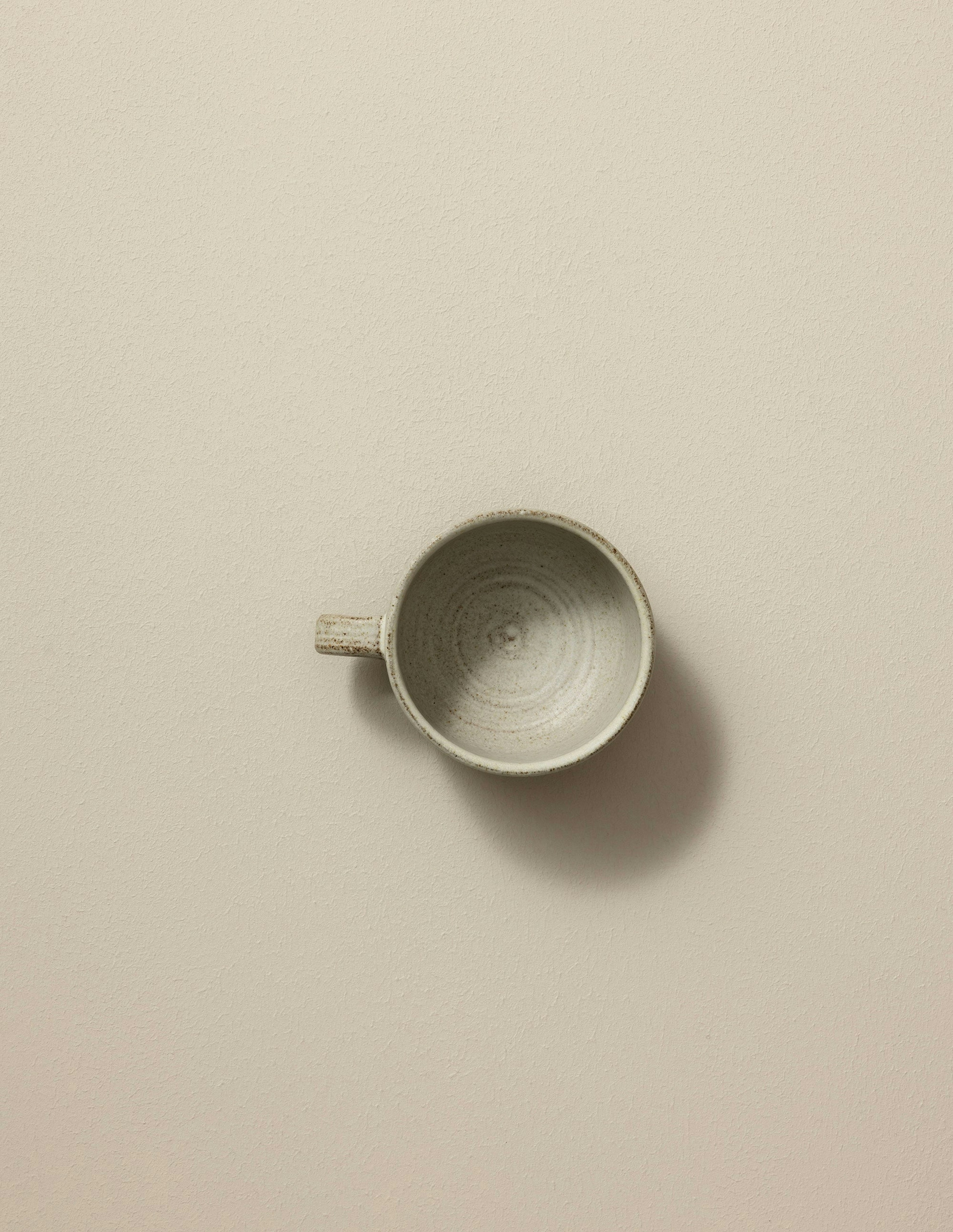 Our Studio Tea Mug comes in a mushroom color with grey-brown clay and glazed inside and out in matte milky white.